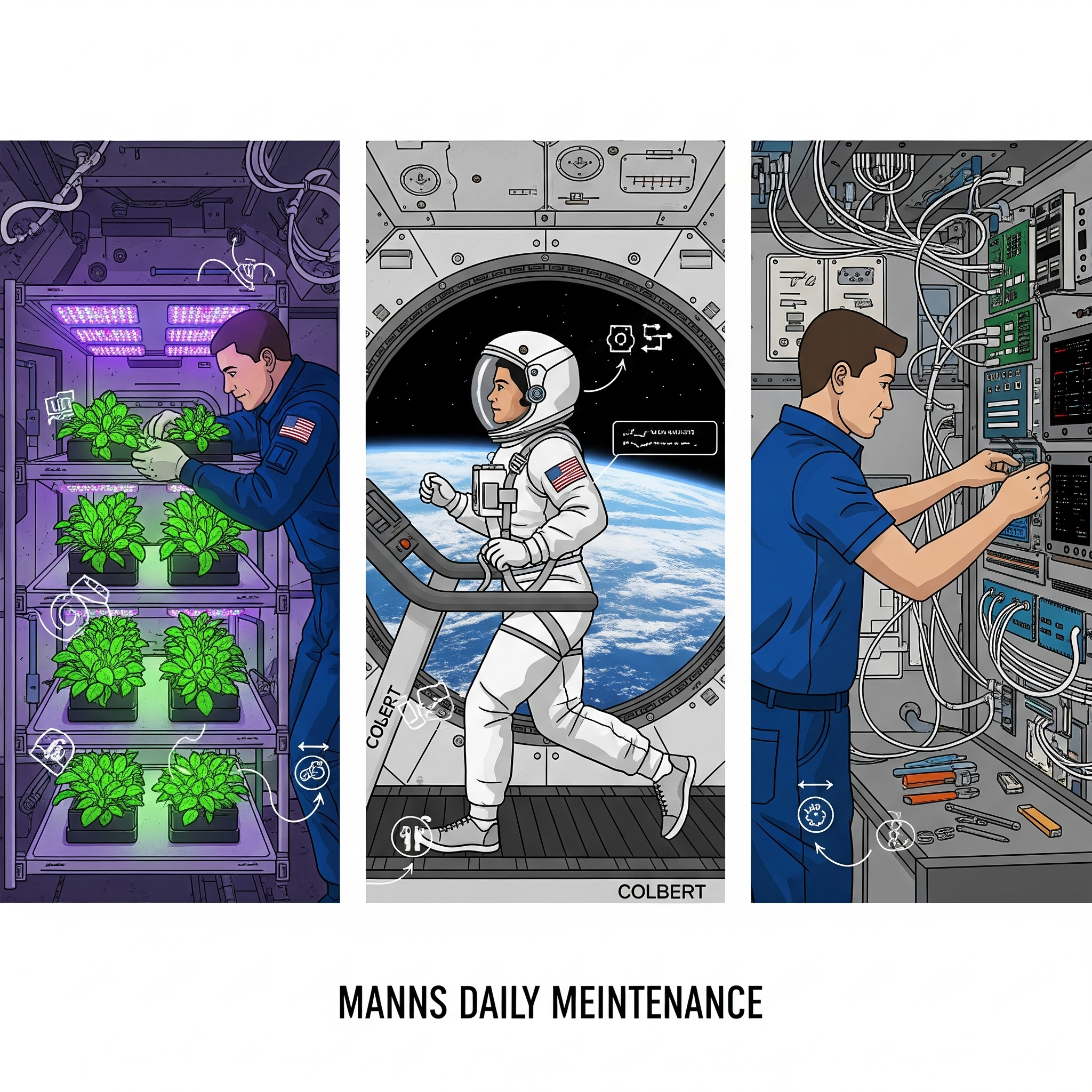식사를 마친 우주비행사들은 지구 각국의 관제 센터와 데일리 플래닝 콘퍼런스(DPC)를 열어 그날의 세부 일정을 최종 점검합니다. 마치 지구의 직장인이 아침 회의로 업무를 시작하는 것과 같죠. 그들의 하루는 5분 단위로 빽빽하게 계획되어 있으며, 주어진 임무는 크게 과학 실험과 정거장 유지 보수, 그리고 건강 관리를 위한 운동으로 나뉩니다.