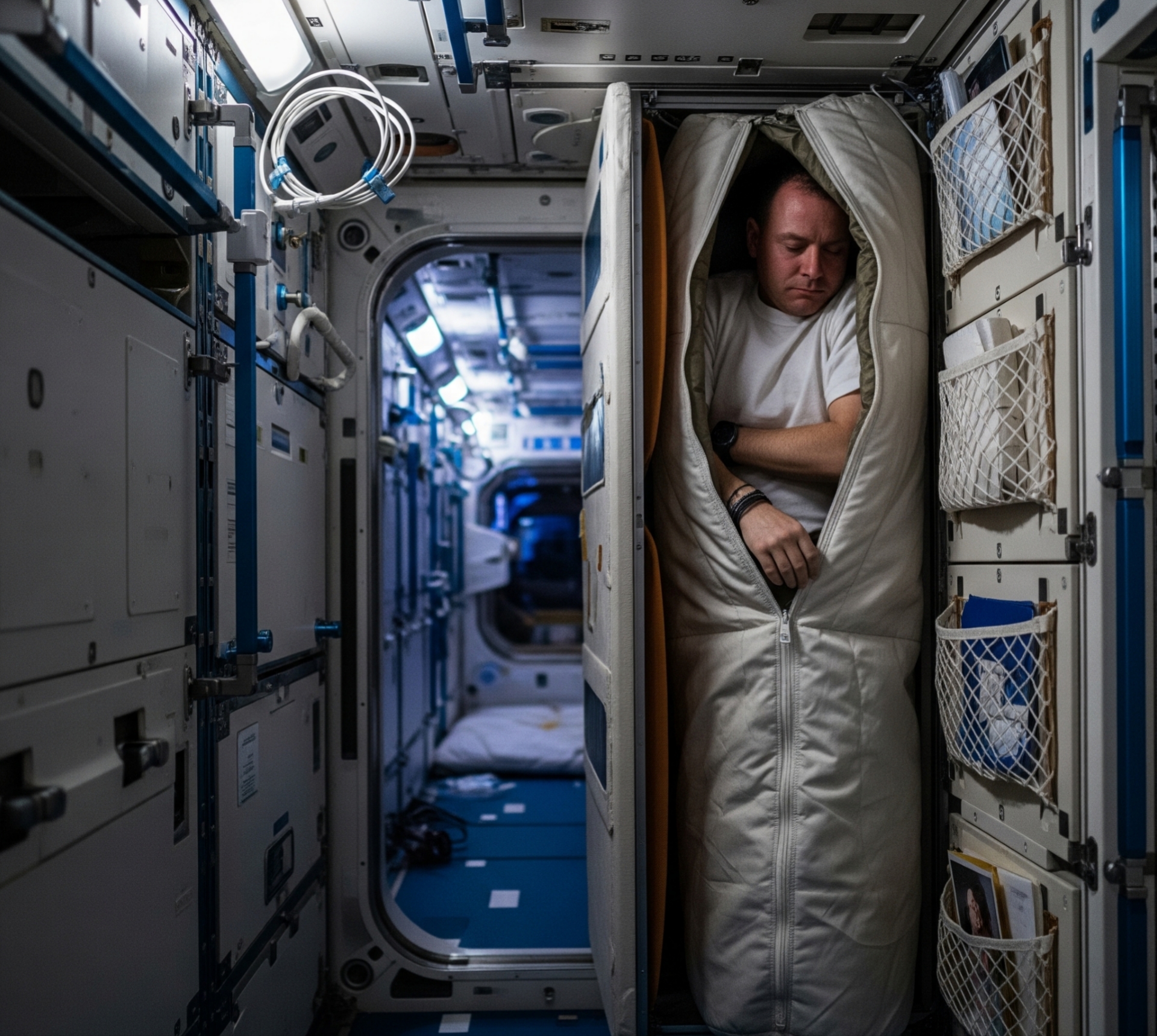 모든 일과를 마친 우주비행사들은 각자의 개인 수면 공간으로 들어갑니다. 벽에 수직으로 부착된 침낭 안에 몸을 고정하고 잠을 청하며, 국제 우주 정거장에서의 길고도 분주했던 하루를 마무리합니다.