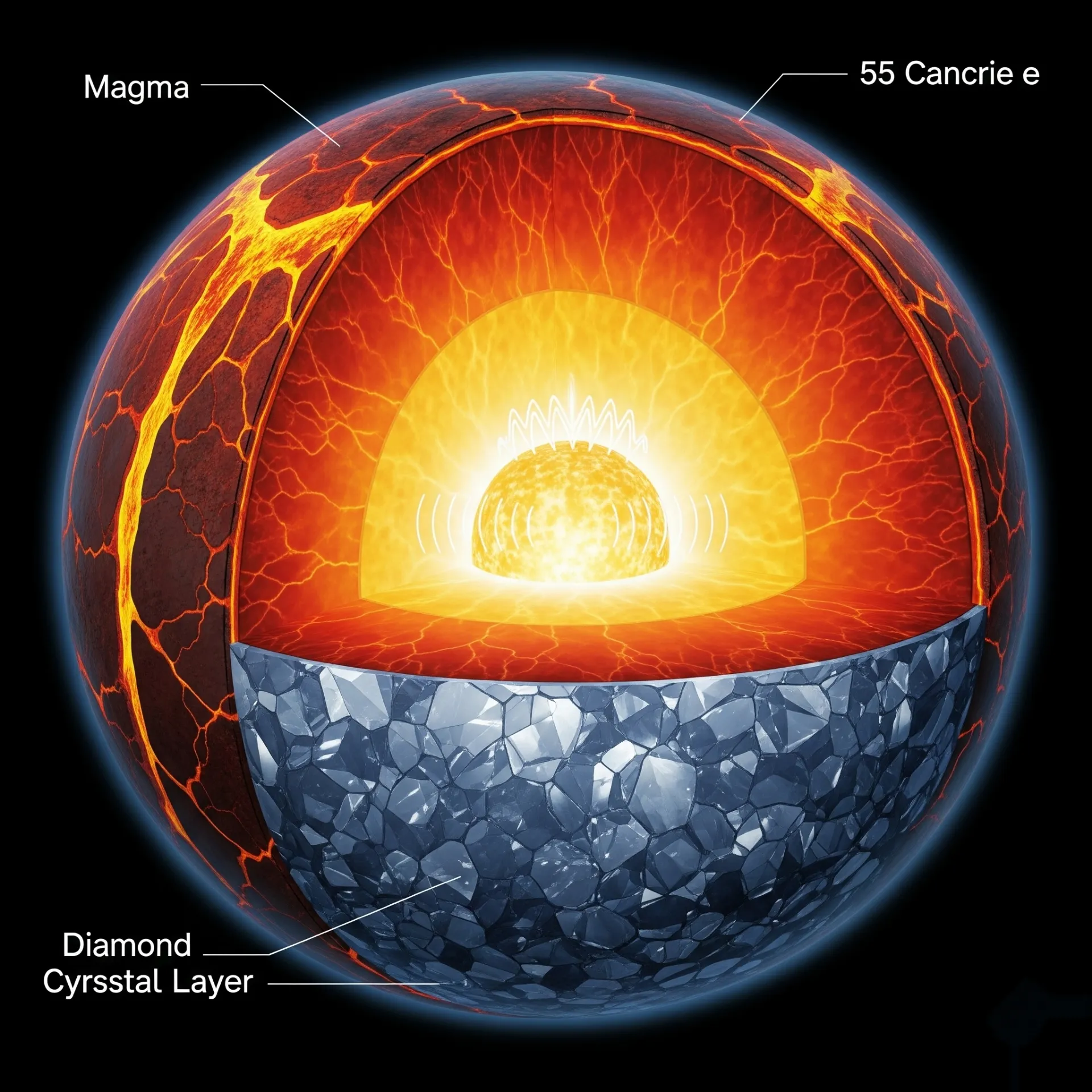 과학자들이 55 Cancri e를 주목하는 가장 큰 이유는 바로 풍부한 탄소 때문입니다. 우리 태양계의 암석 행성들은 대부분 산소와 규소를 중심으로 이루어져 있습니다. 하지만 55 Cancri e는 탄소의 비율이 매우 높은 탄소 행성일 가능성이 큽니다. 과학자들은 행성 내부의 엄청난 온도와 압력이 이 풍부한 탄소를 거대한 다이아몬드 층으로 바꾸어 놓았을 것이라고 추측합니다.