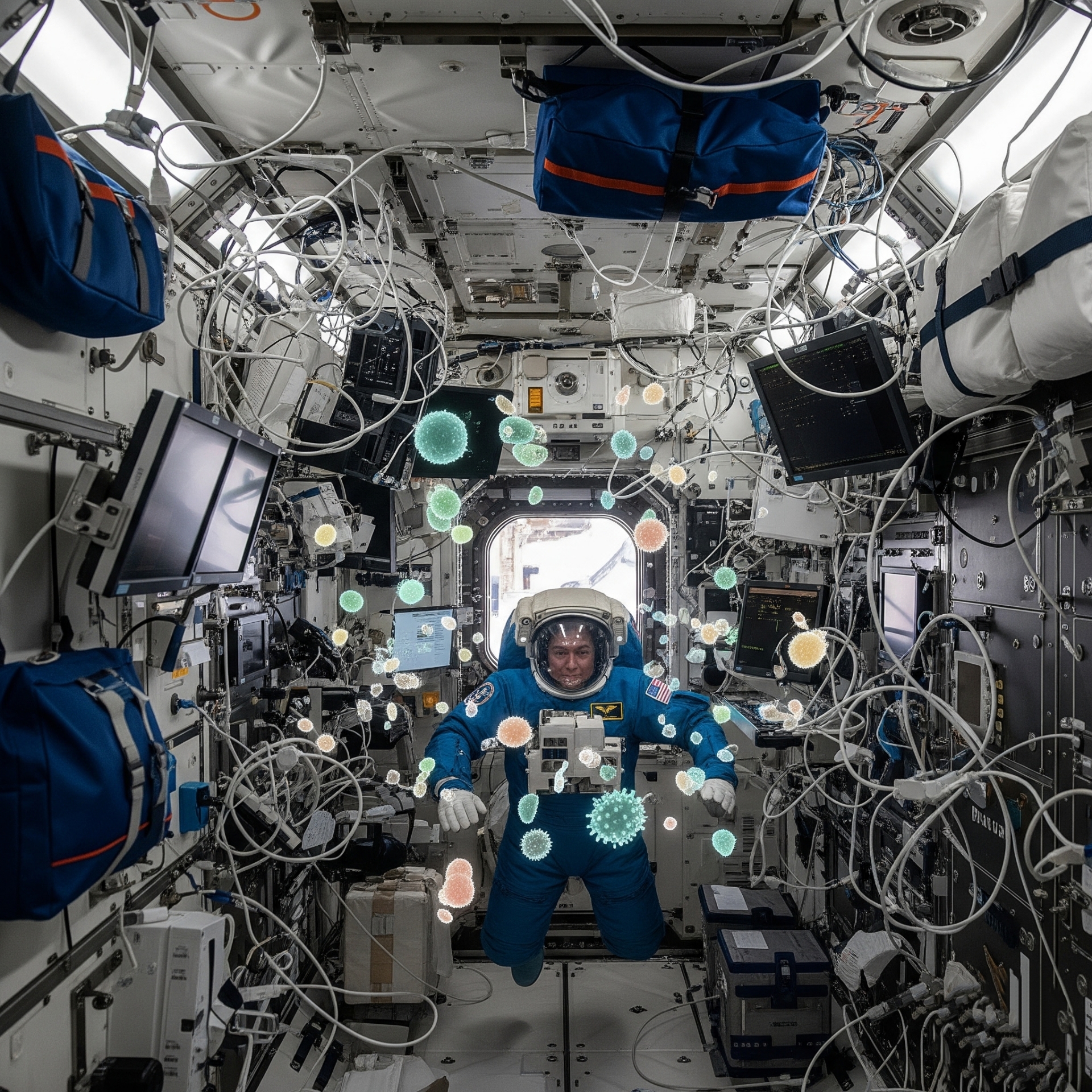 - 미세 입자와 미생물: 우주에서는 중력이 거의 없어 먼지가 바닥에 가라앉지 않고 공기 중에 계속 떠다닙니다. 사람의 피부 각질, 옷의 섬유 조각 등이 모두 미세먼지가 됩니다. 또한 따뜻한 온도와 습도는 세균이나 곰팡이가 번식하기 좋은 환경을 제공할 수 있습니다.