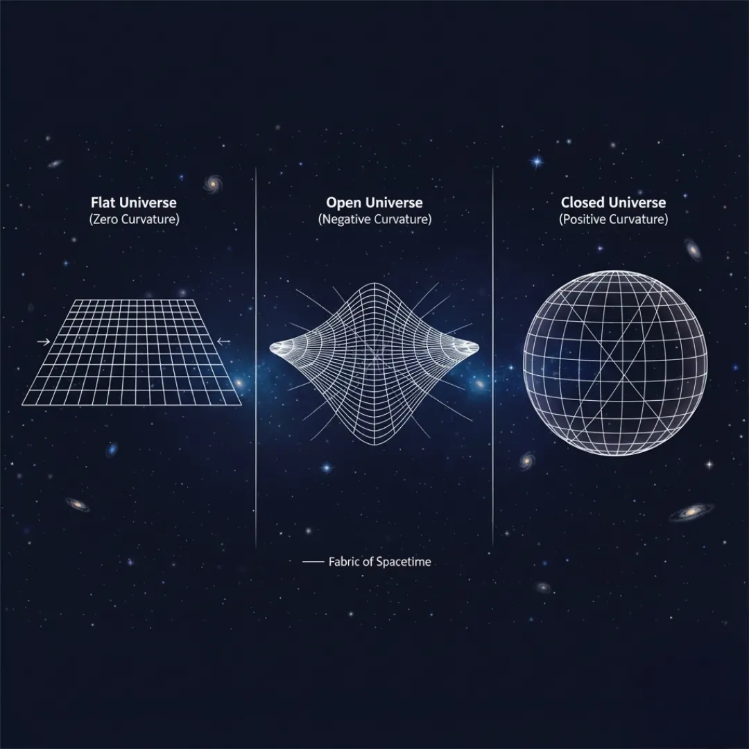 - 닫힌 우주 (양의 곡률): 공 표면처럼 유한하지만 경계는 없습니다. 한 방향으로 계속 나아가면 결국 출발점으로 돌아옵니다.