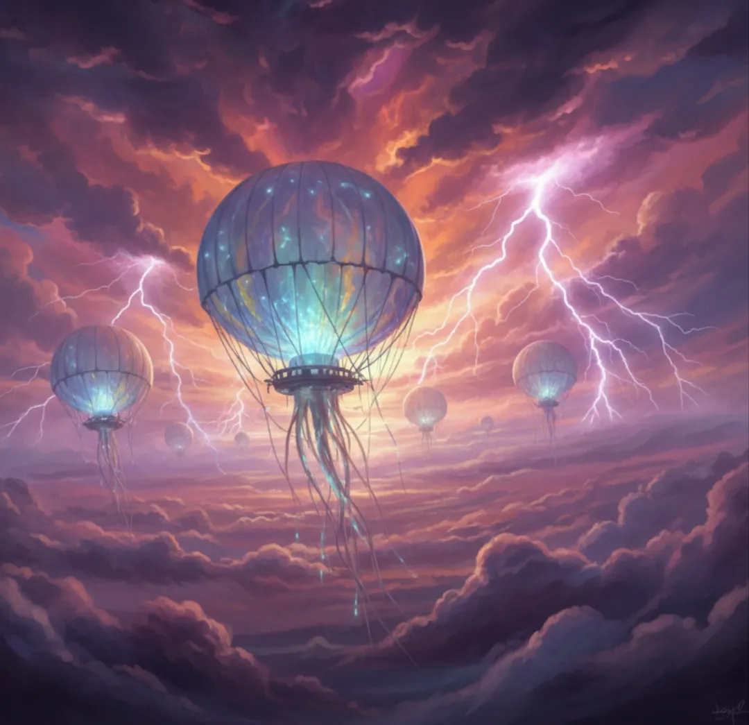 - 플로터(Floaters): 거대한 풍선이나 비행선처럼 생긴 생명체입니다. 몸속에 주변 대기보다 가벼운 기체를 채워 부력을 이용해 특정 고도에 떠다닙니다. 이들은 대기 중의 유기물을 먹거나 광합성을 할 수도 있습니다.