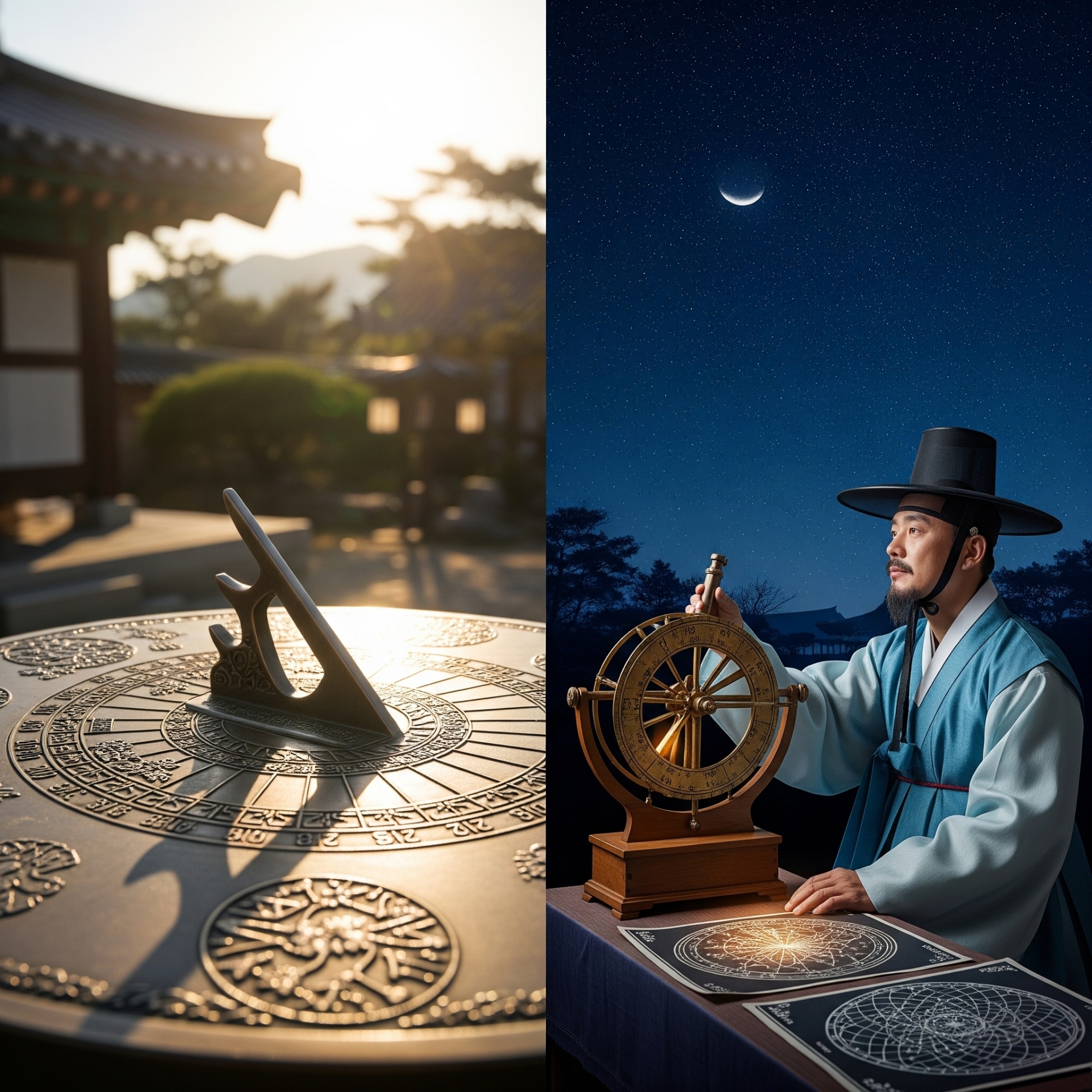 밤하늘의 별들은 북극성을 중심으로 하루에 한 바퀴씩 규칙적으로 회전합니다. 이 움직임을 이용한 것이 별시계입니다. 특정 별이 기준선에 도달하는 것을 보고 시간을 측정했는데, 이는 하늘에 거대한 시곗바늘이 움직이는 것과 같은 원리입니다. 조선 세종 때 만들어진 일성정시의는 낮에는 해시계로, 밤에는 별시계로 사용할 수 있었던 주야 겸용 시계로, 당대 최고의 천문 지식이 집약된 발명품이었습니다.