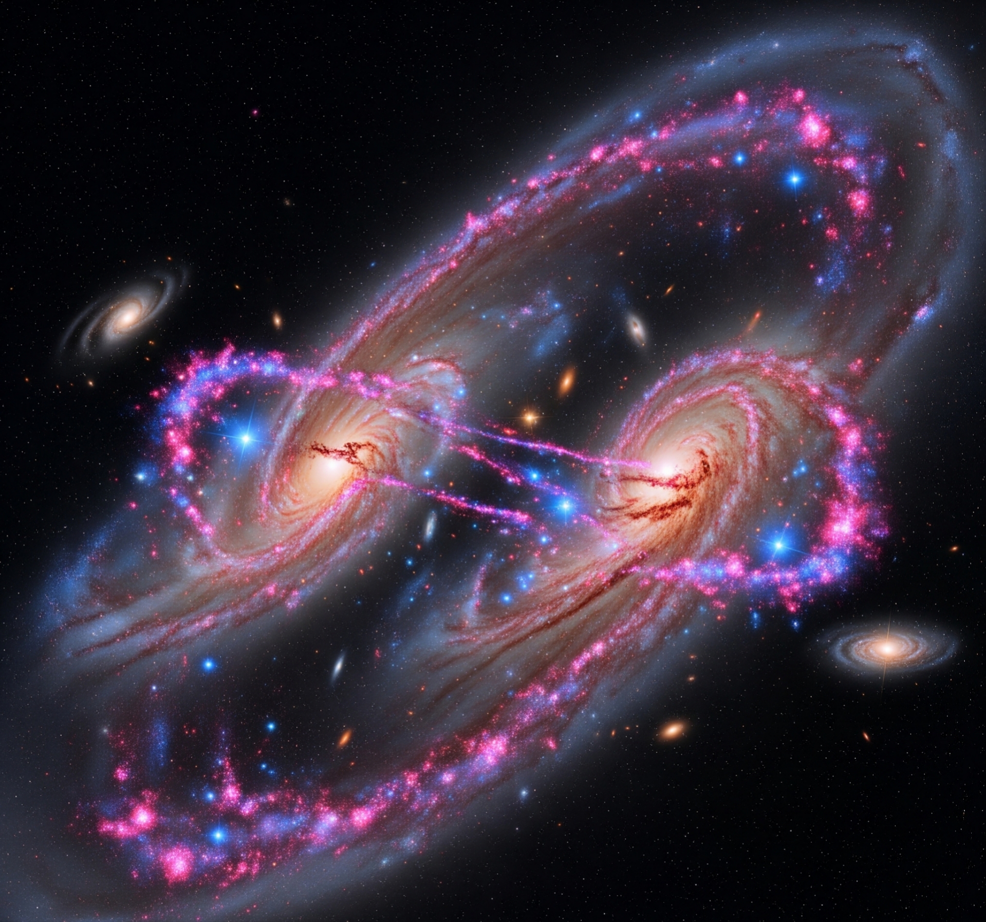 두 은하는 서로의 중심부를 스치듯 지나가지만, 중력의 영향은 극에 달합니다. 이 과정에서 은하 내부에 있던 거대한 가스와 먼지 구름이 압축되면서 폭발적인 별 형성, 즉 스타버스트(Starburst) 현상이 일어납니다. 수많은 새로운 별들이 한꺼번에 태어나면서 두 은하는 평소보다 훨씬 밝게 빛나게 됩니다.