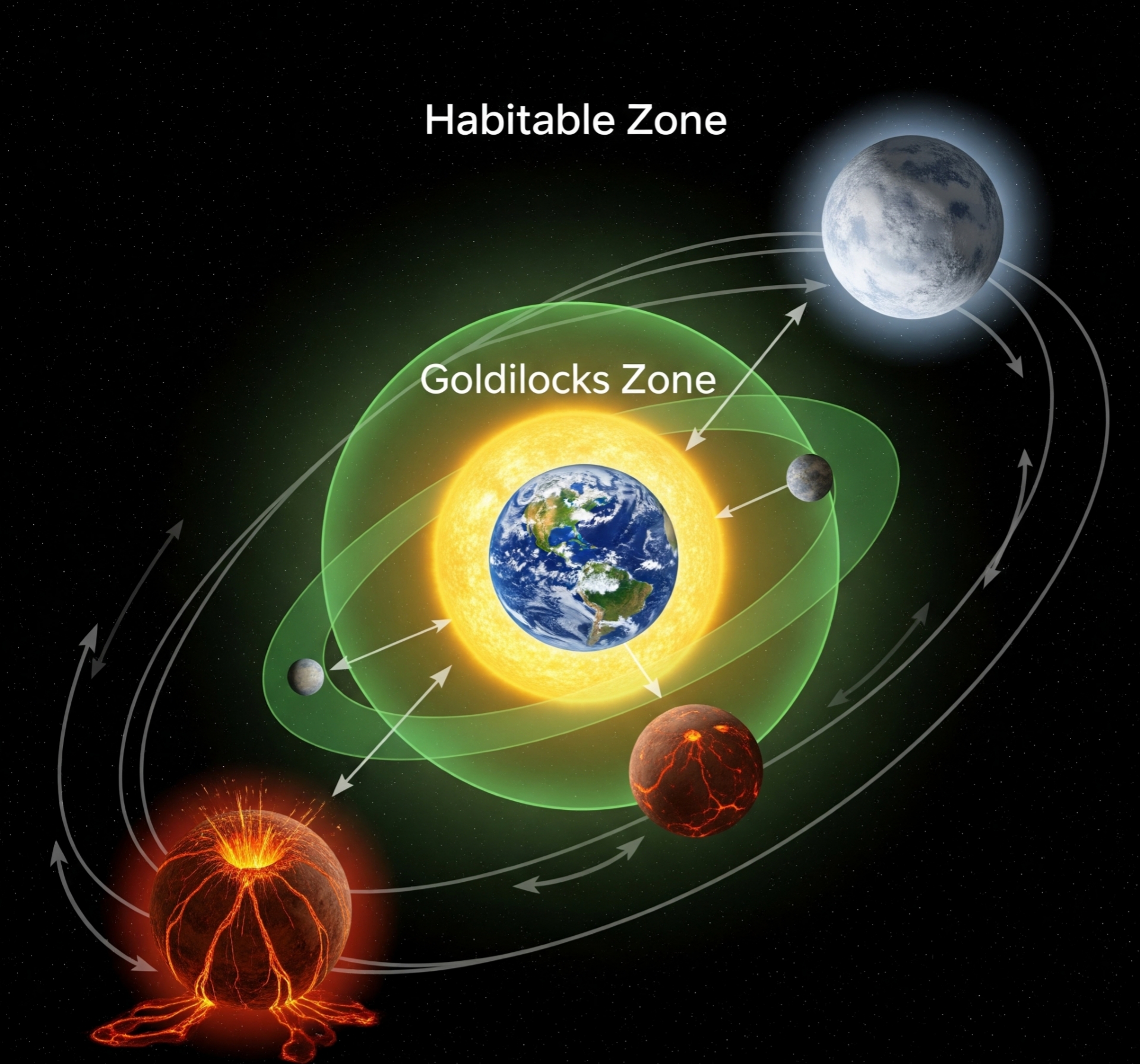 - 생명체 거주 가능 지대 (Habitable Zone): 골디락스 존(Goldilocks Zone)이라고도 불립니다. 중심 별에서 너무 가깝지도, 너무 멀지도 않은 적절한 거리에 있어 행성 표면에 액체 상태의 물이 존재할 수 있는 영역을 뜻합니다. 너무 가까우면 물이 모두 증발해버리고, 너무 멀면 꽁꽁 얼어붙기 때문입니다.