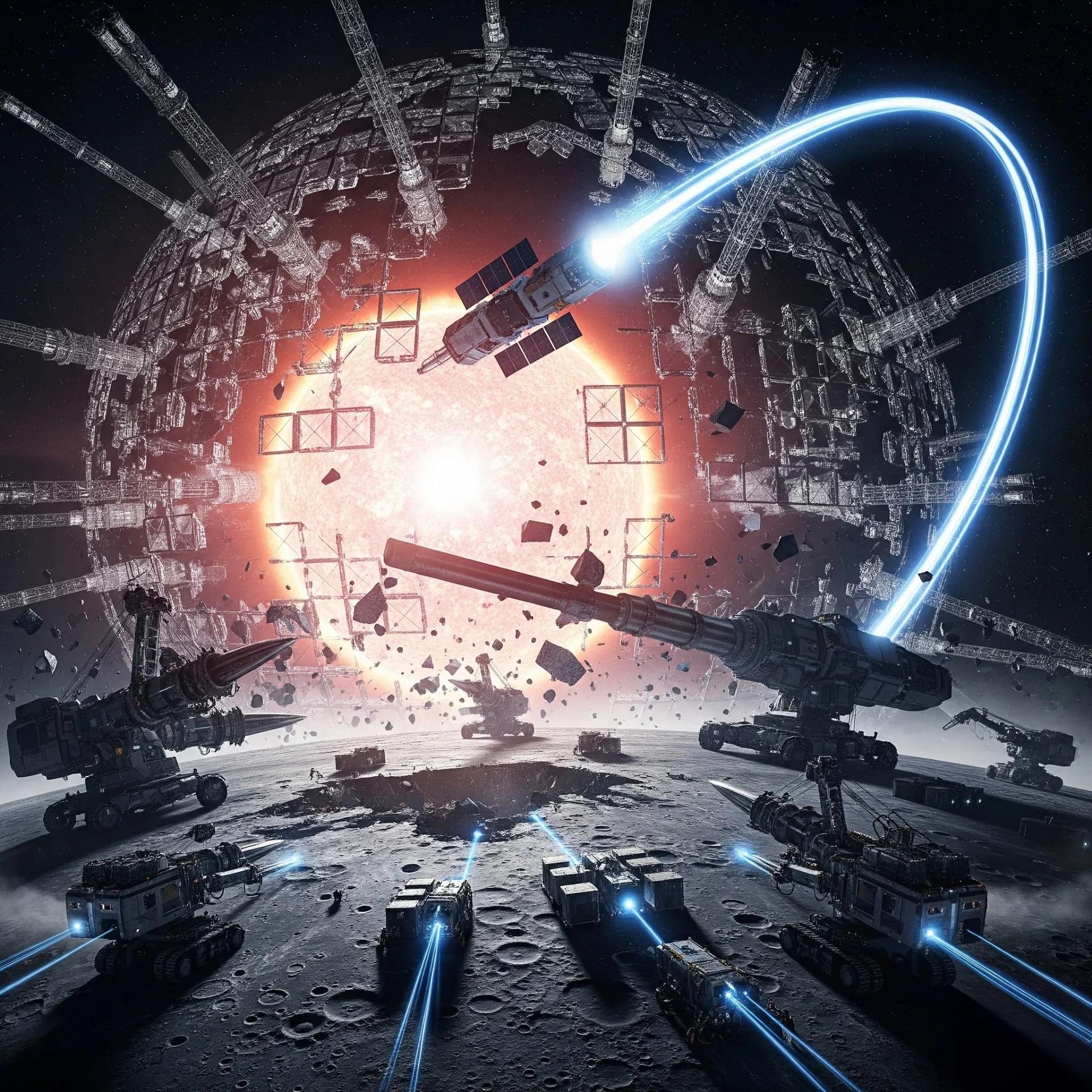 • 재료 조달: 가장 유력한 재료 공급원은 행성 수성입니다. 수성은 태양과 가깝고 금속 자원이 풍부하며, 중력이 낮아 채굴한 자원을 우주로 보내기 유리합니다.